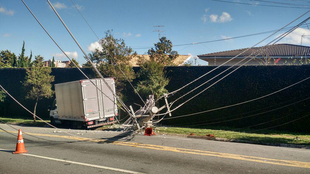 Um caminhão bateu em um carro. Um poste foi danificado e uma equipe da Eletropaulo esteve no local realizando a manutenção.