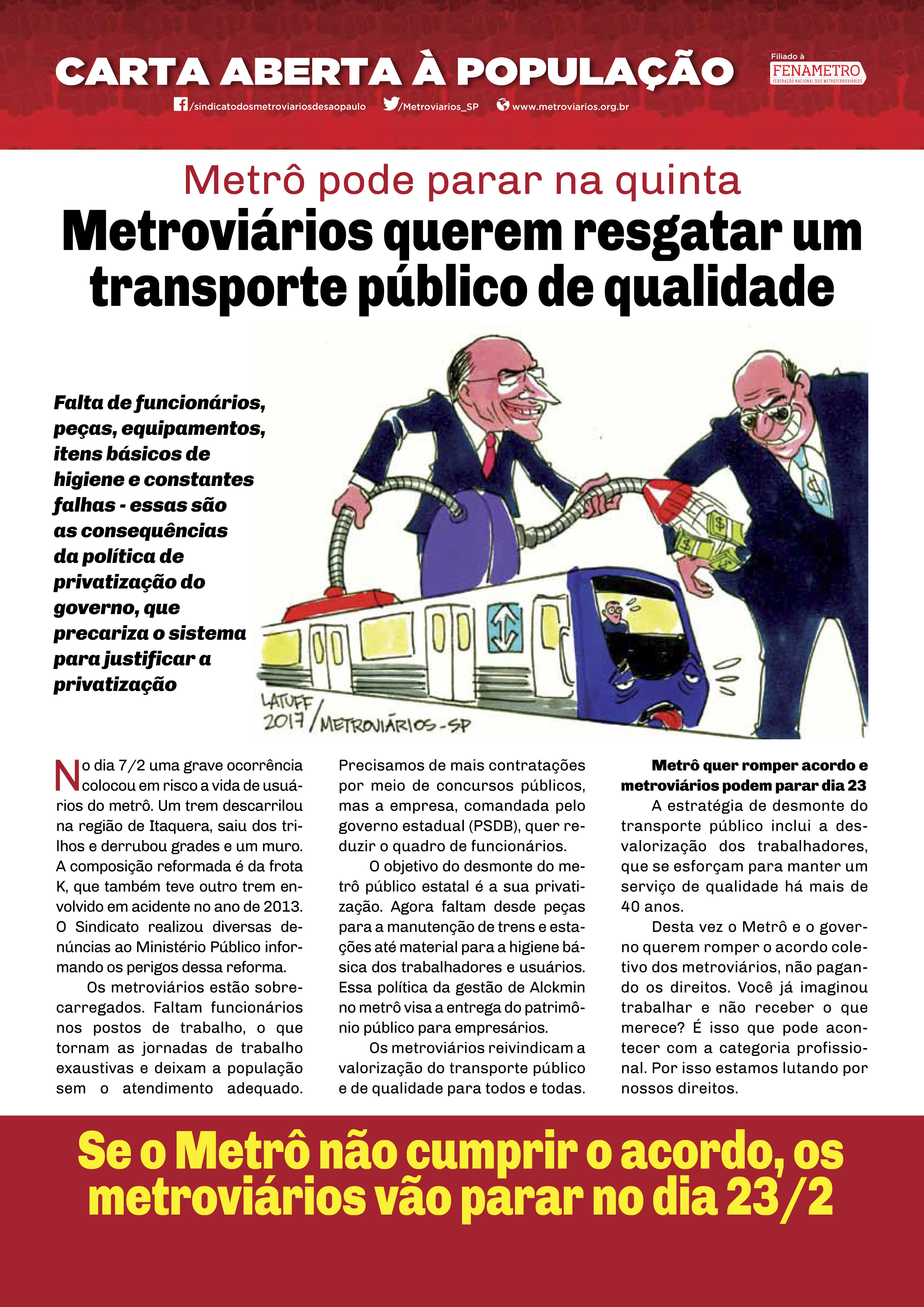 Uma carta aberta à população havia sido distribuída na terça-feira (21/2) para os passageiros nas estações do Metrô.