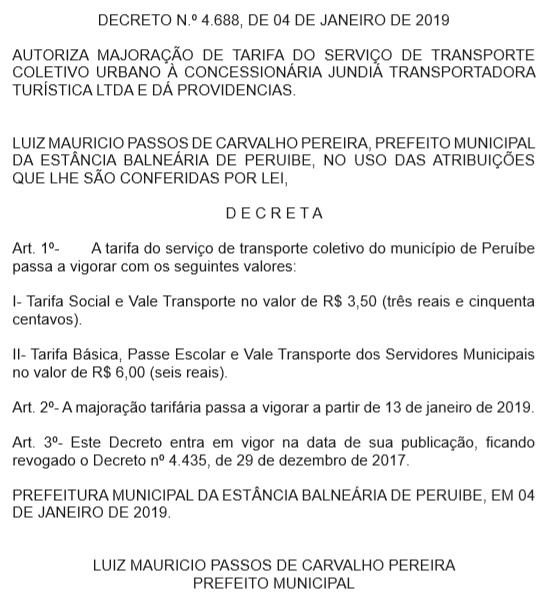 O decreto que autoriza o reajuste foi assinado pelo prefeito Luiz Maurício, no dia 4 de janeiro, sendo publicado no Diário Oficial, no dia 8 de janeiro.