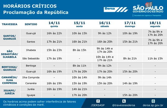 A Operação Proclamação da República 2019 nas Travessias Litorâneas do Estado de São Paulo terá início à meia-noite desta sexta-feira, dia 15 de novembro e segue até à meia-noite de domingo, dia 17 de novembro. Neste período, são esperados quase 200 mil motoristas, entre automóveis, motos, caminhões, bicicletas e pedestres, em todos os sistemas dos litorais centro, norte e sul.