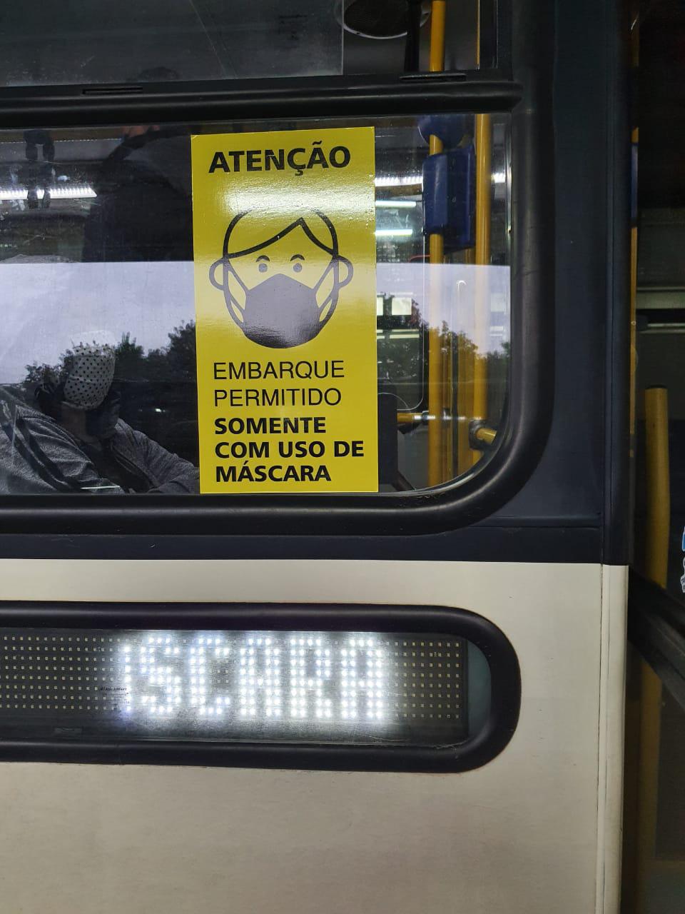 As empresas de ônibus reforçam a medida com a manutenção de adesivos fixados nos para-brisas dianteiros dos ônibus com os dizeres “Embarque permitido somente com o uso de máscaras”.
