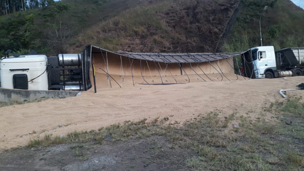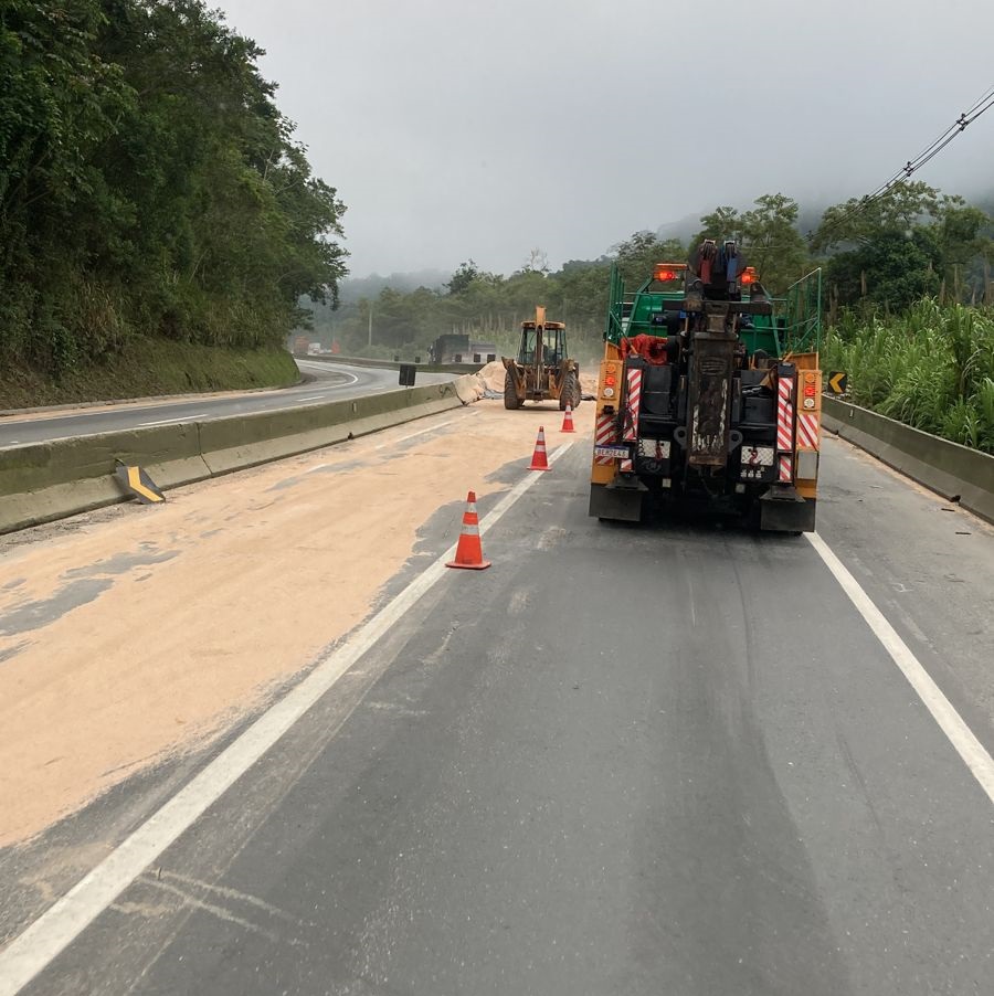 Um tombamento de carreta foi registrado no km 363, na pista sentido São Paulo, em Miracatu, por volta das 3h da madrugada. Houve derramamento da carga de farelo de trigo nas pistas sentido Curitiba e São Paulo. O motorista não se feriu.