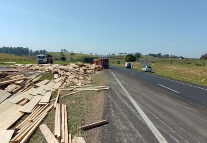 O condutor da carreta sofreu ferimentos leves. O veículo transportava 37 toneladas de madeira e houve derramamento total da carga.