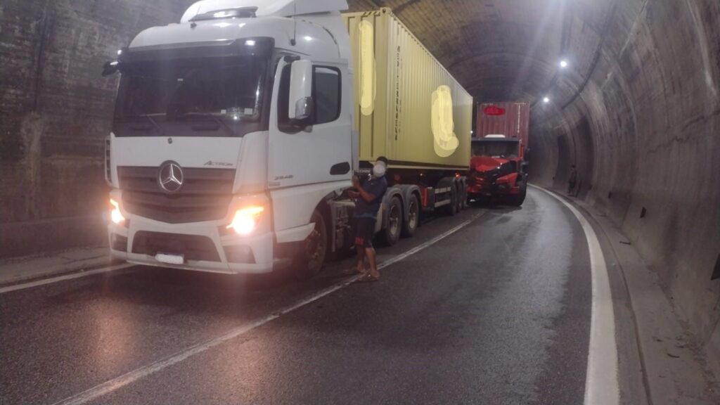 Uma colisão traseira entre uma carreta Scania MB (contêiner de 40) e uma carreta Scania (contêiner de 40) foi registrada no km 45,8, dentro do túnel TD-01, sentido Litoral, em Cubatão, às 17h14 desta sexta, 15 de setembro.