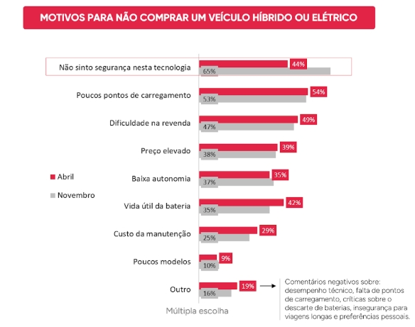 Outros fatores também apareceram: vida útil da bateria (42%), preço elevado (39%), autonomia (35%), custo de manutenção (29%), baixa variedade de modelos (9%) e outros motivos (19%).